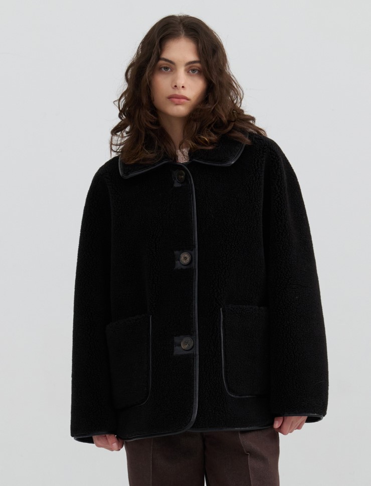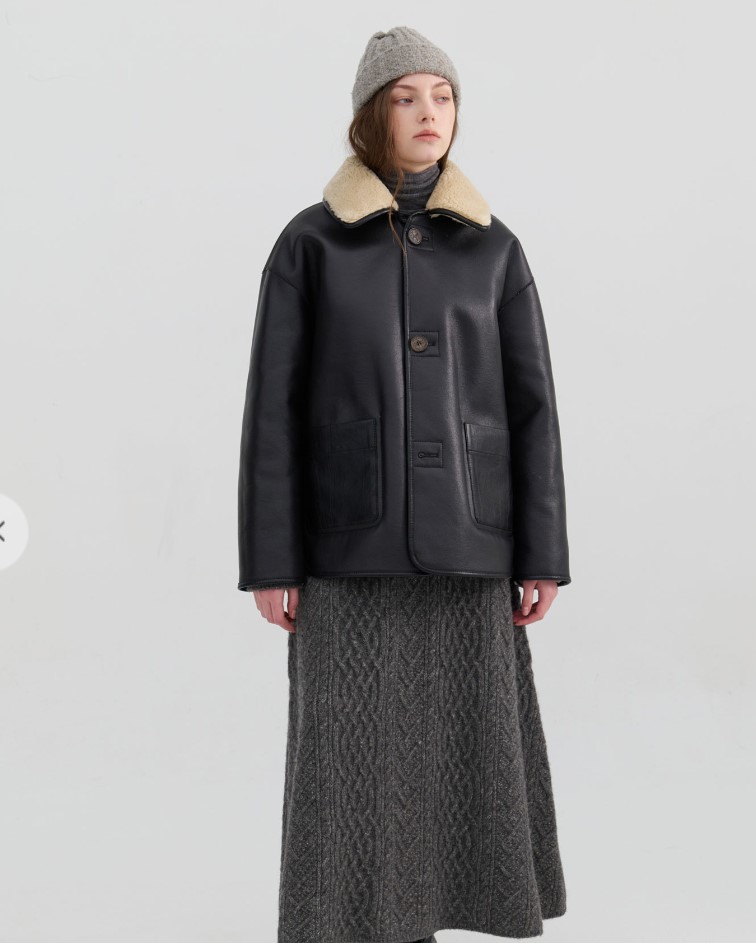 길이가 너무 짧지 않아서 따뜻하게 입기가 좋다. 양면으로 가능한 디자인이라 안쪽은 이렇게 레더 무스탕으로 되어 있다. 레더 무스탕을 뒤집어서 입으면 모델과 같이 검정색이 드러나게 된다. 아무래도 이런 점을 살려서 베이지를 선택한다면 스타일 대비를 주기에 좋을 것 같다.